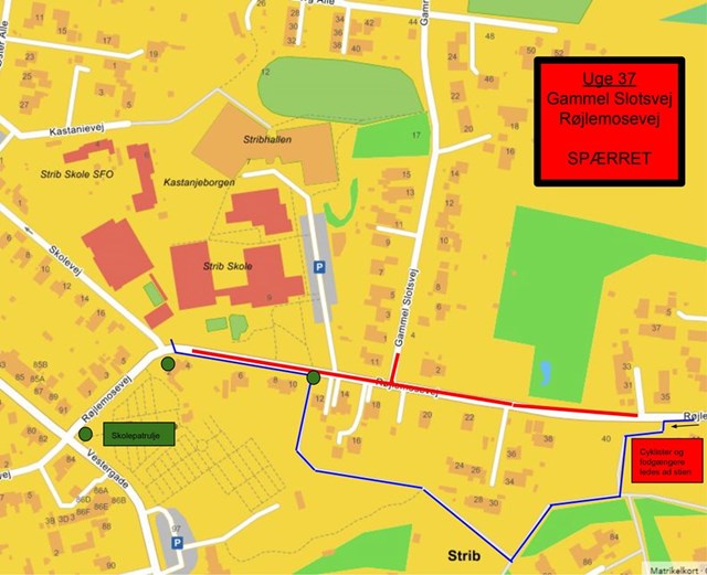 Strækninger, som er spærret, er markeret med rød. De ruter, cyklister og fodgængere skal benytte, er markeret med blå. Skolepatruljens placeringer er markeret med grøn.